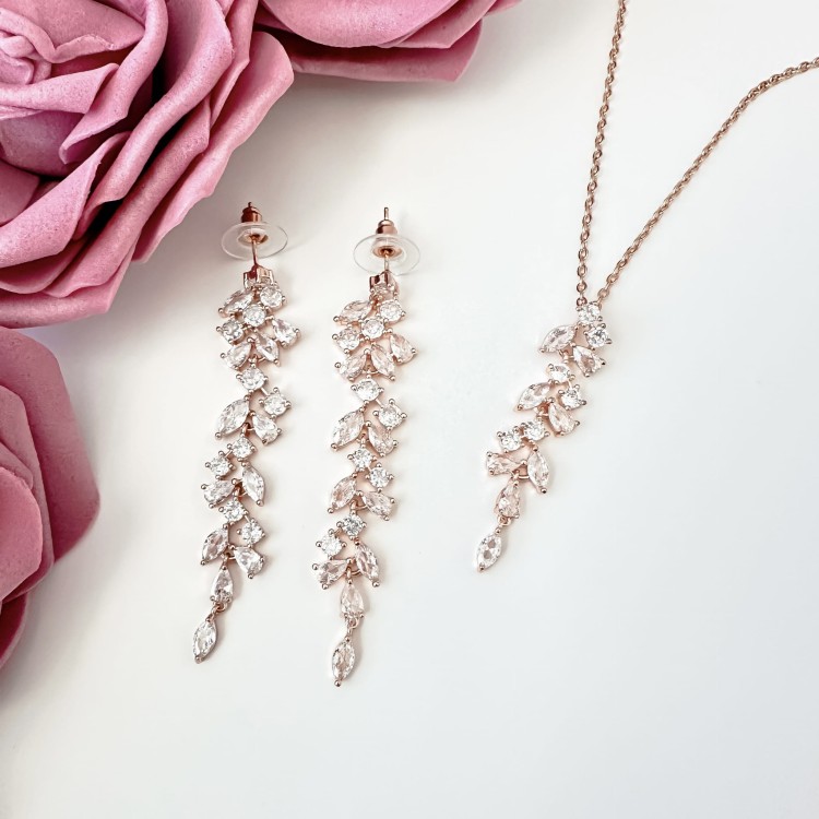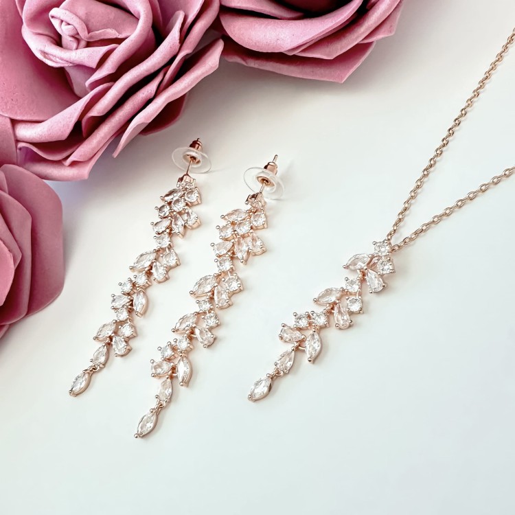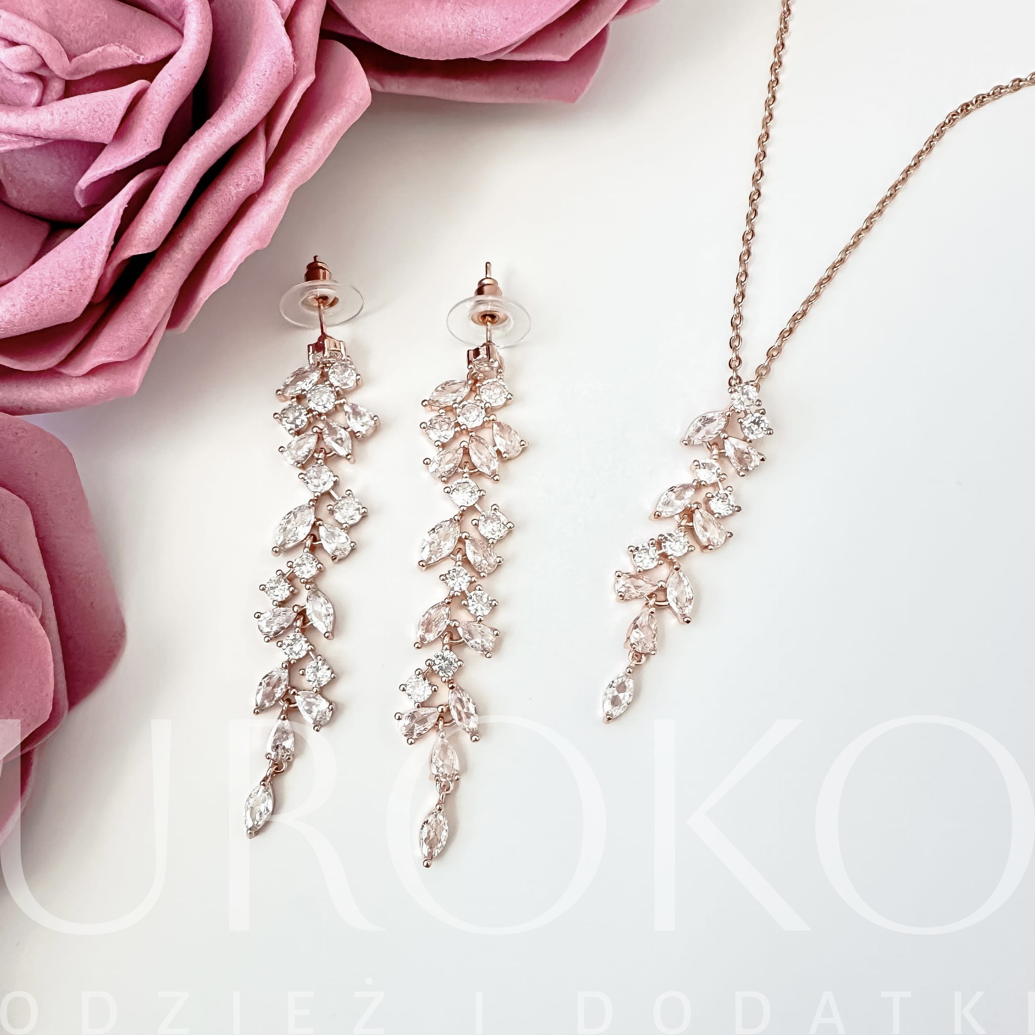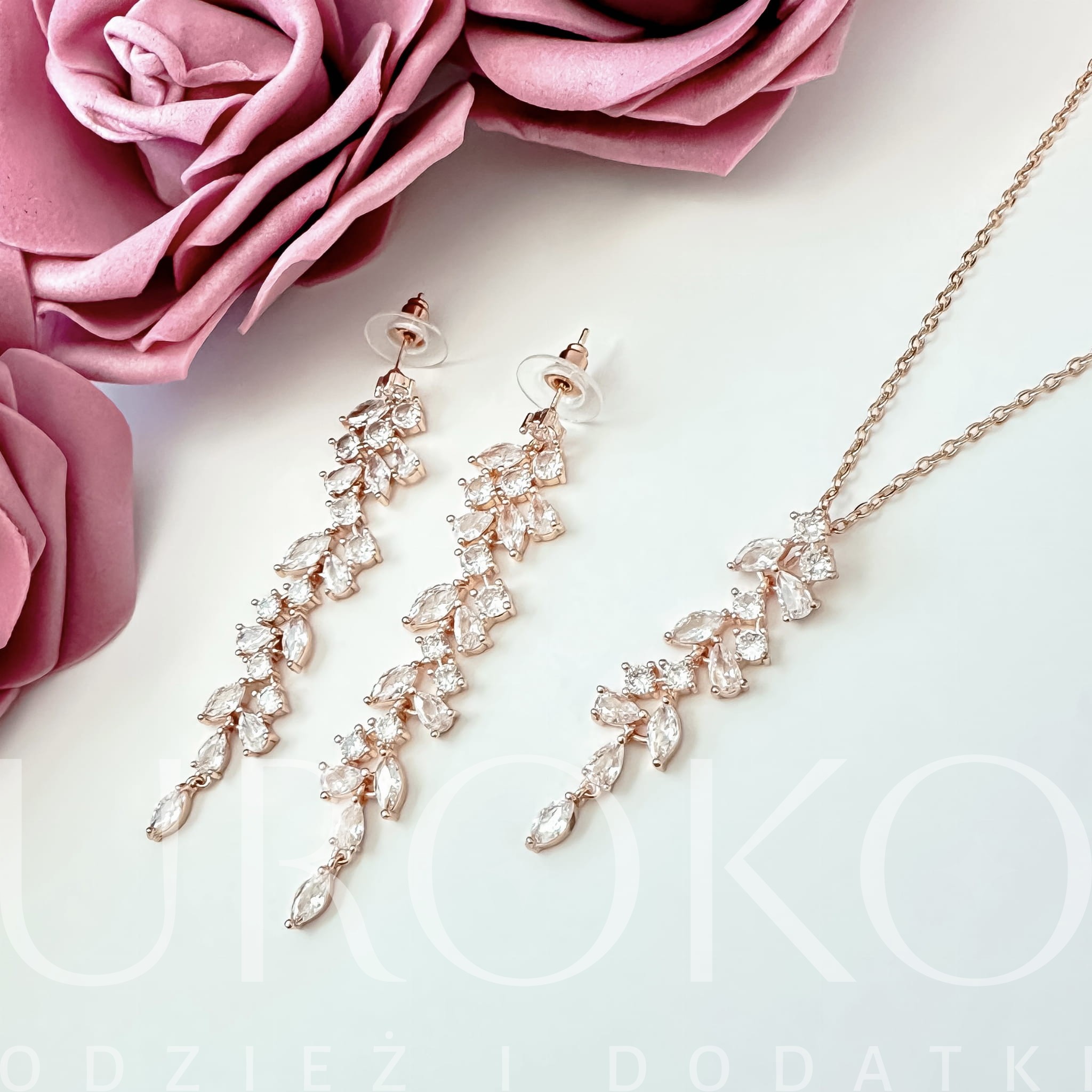 Producent UrokoRóżowe złoto komplet zestaw ślubny biżuterii Grace listki z cyrkoniami naszyjnik + kolczyki
