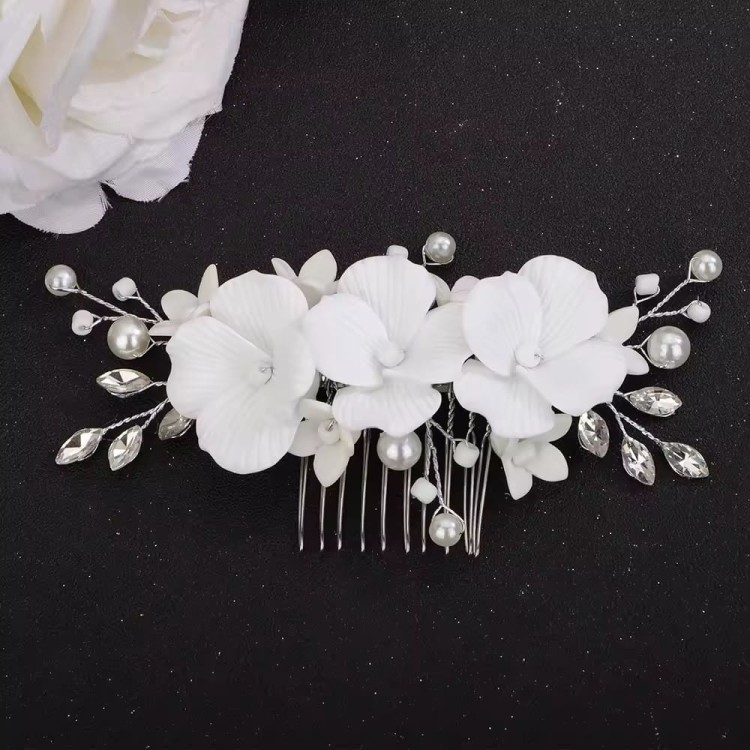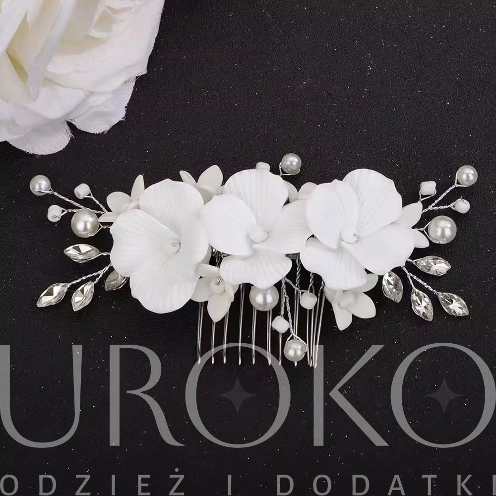 Ślubny grzebyk ozdoba do włosów Alice w kolorze srebrnym z białymi kwiatkami