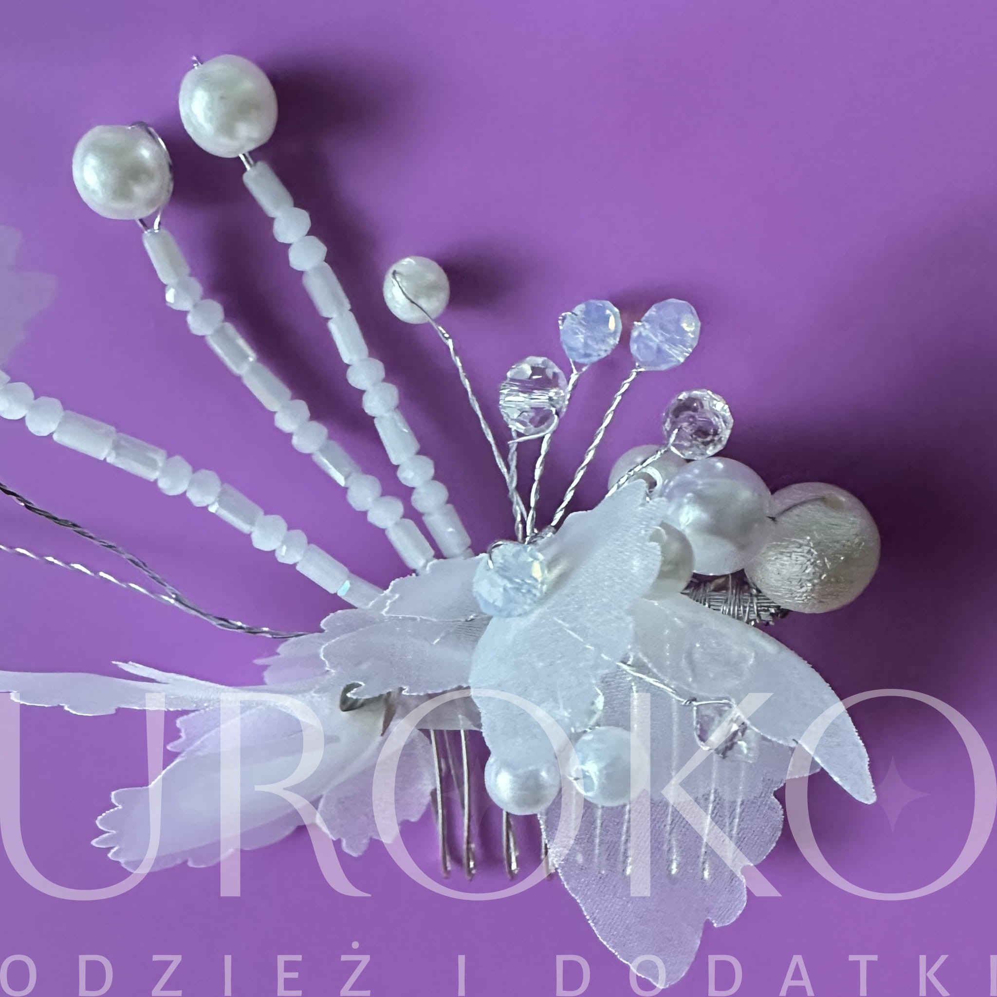 Kolor: srebrny z białymi kwiatami, perłami i przeźroczystymi koralikami