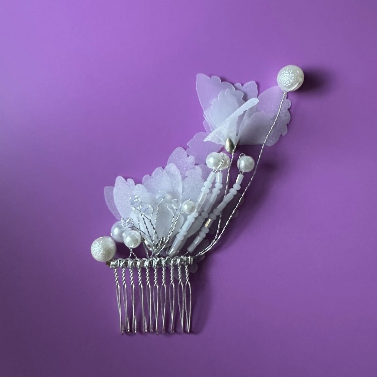 Srebrny grzebyk ślubny z materiałowymi białymi kwiatami spinka dla Panny Młodej